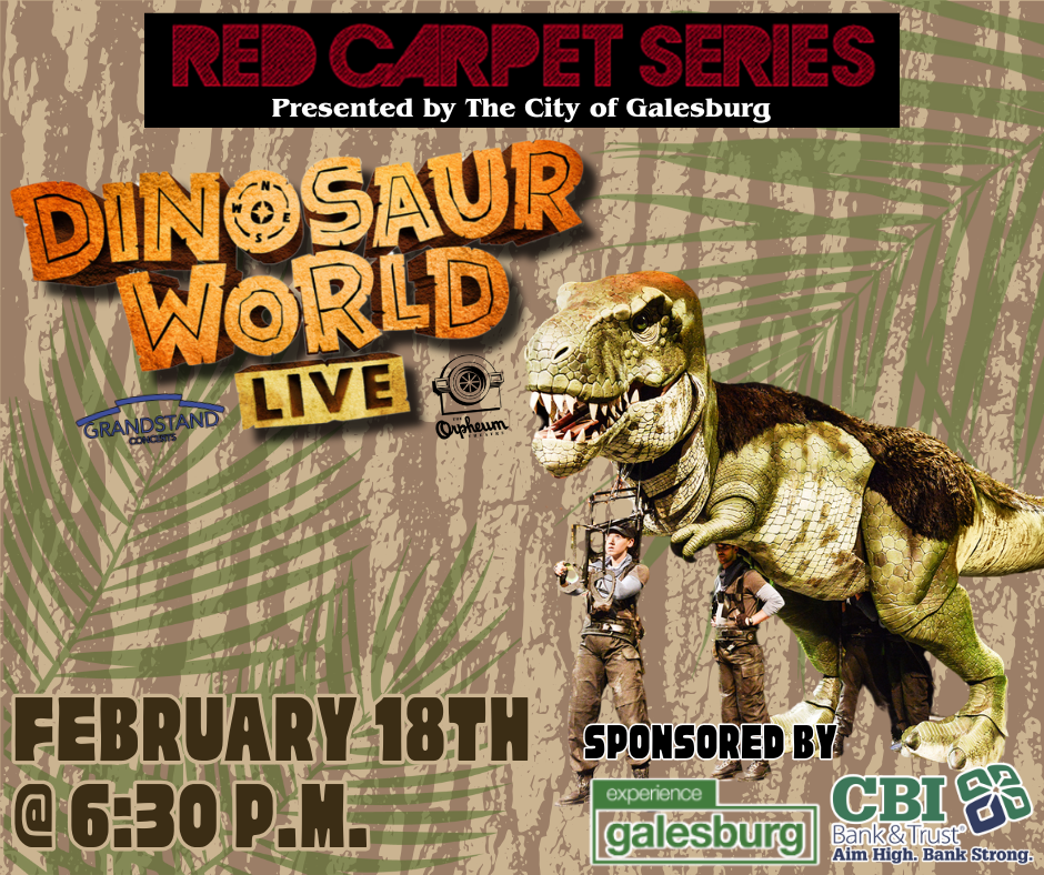 6:30pm | Live Stage show featuring all your favorite Dinos. Sponsored by CBI Bank & Trust and Experience Galesburg RED CARPET SERIES presented by The City of Galesburg, The Orpheum Theatre Presents, & Grandstand Concerts